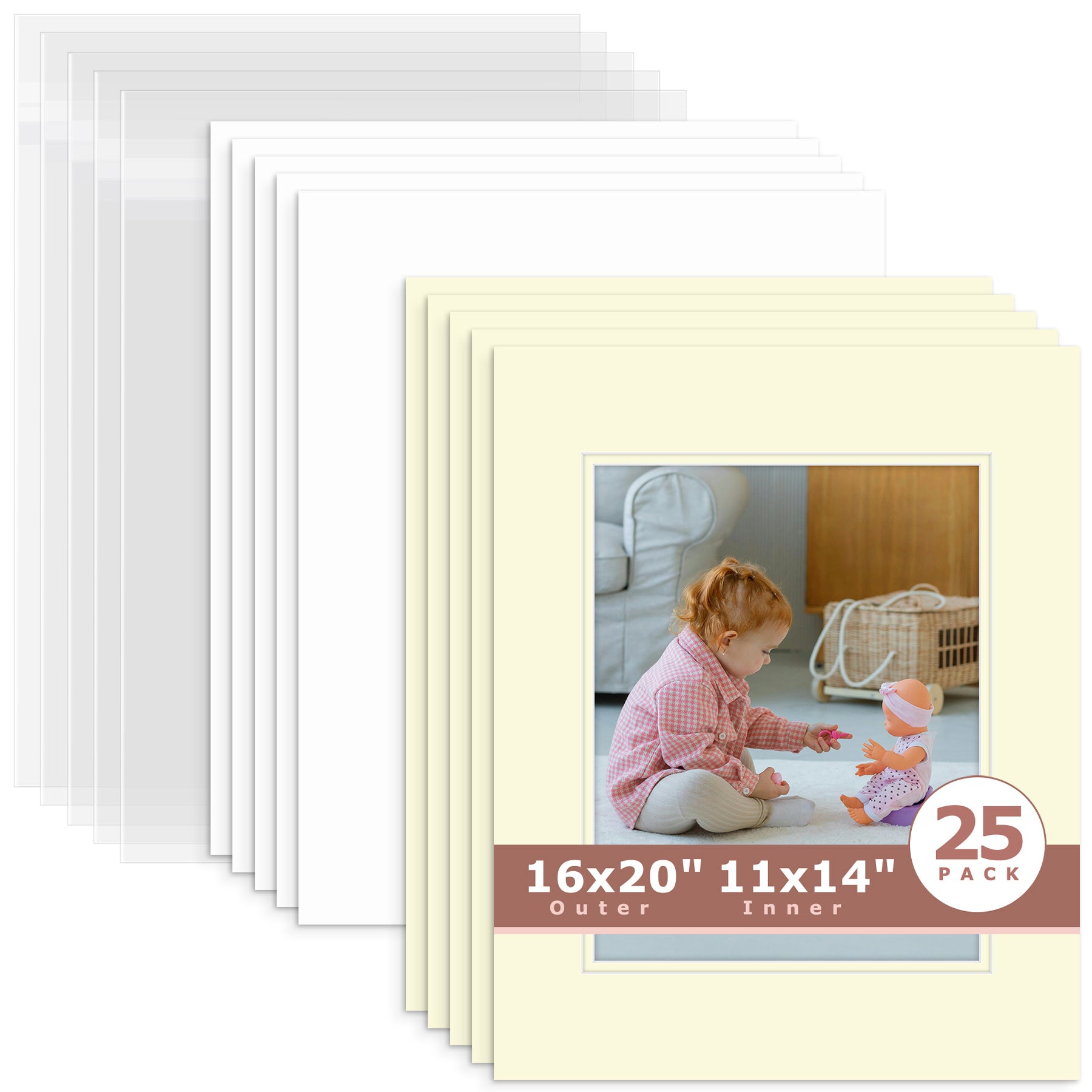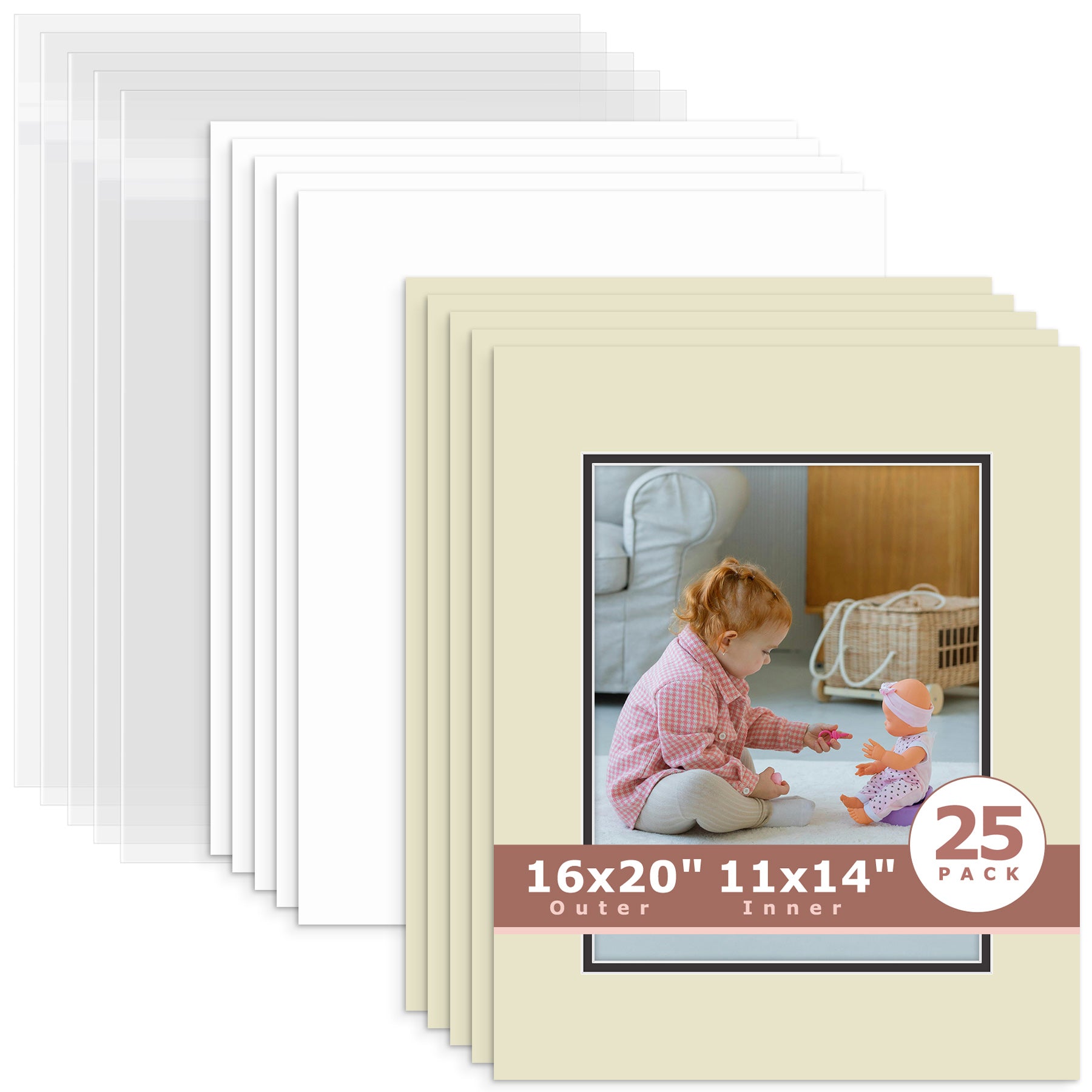 25 Pack 16x20 Economy Pre-Cut Double Mat For 11x14 Photo + Backing + Bag Ivory Ivory