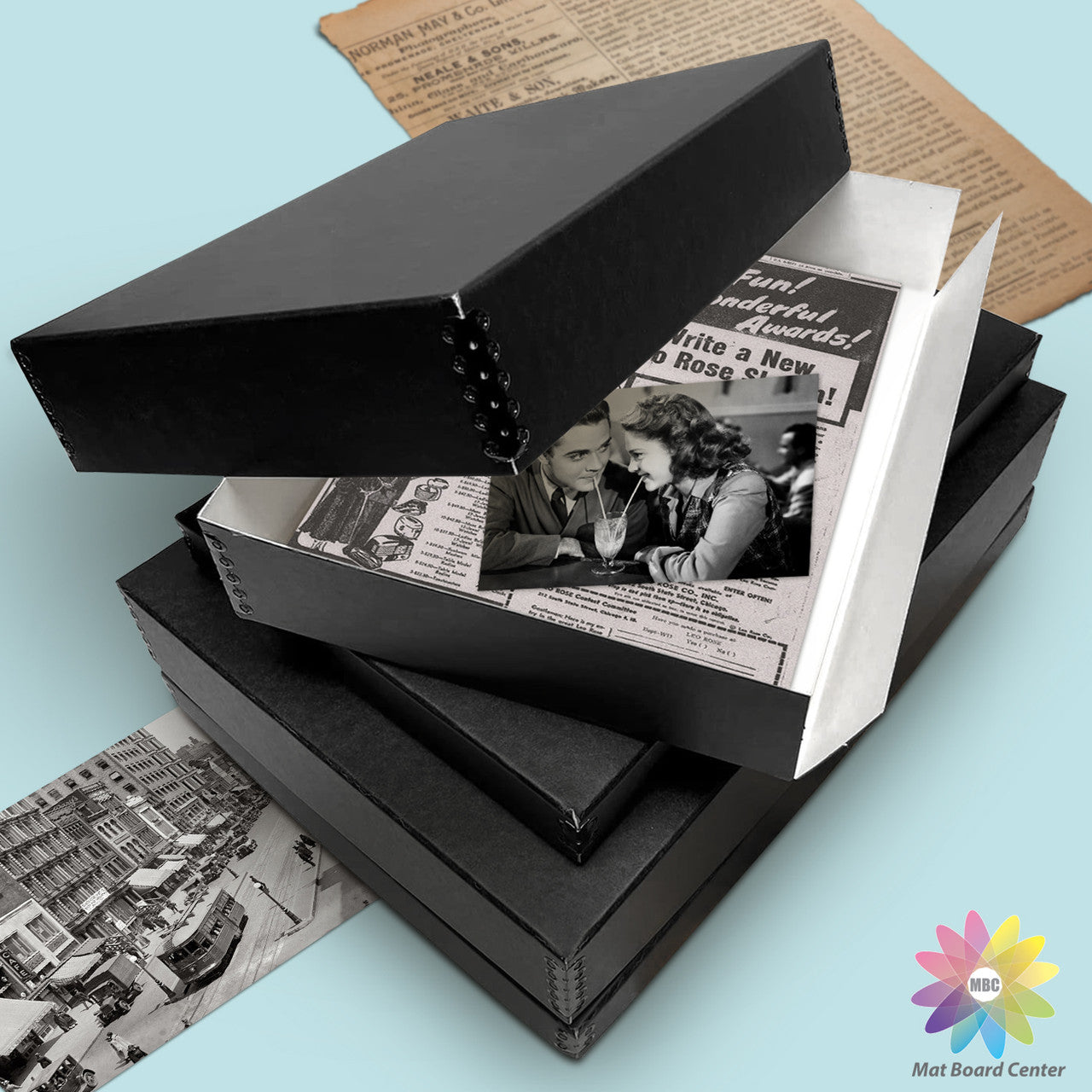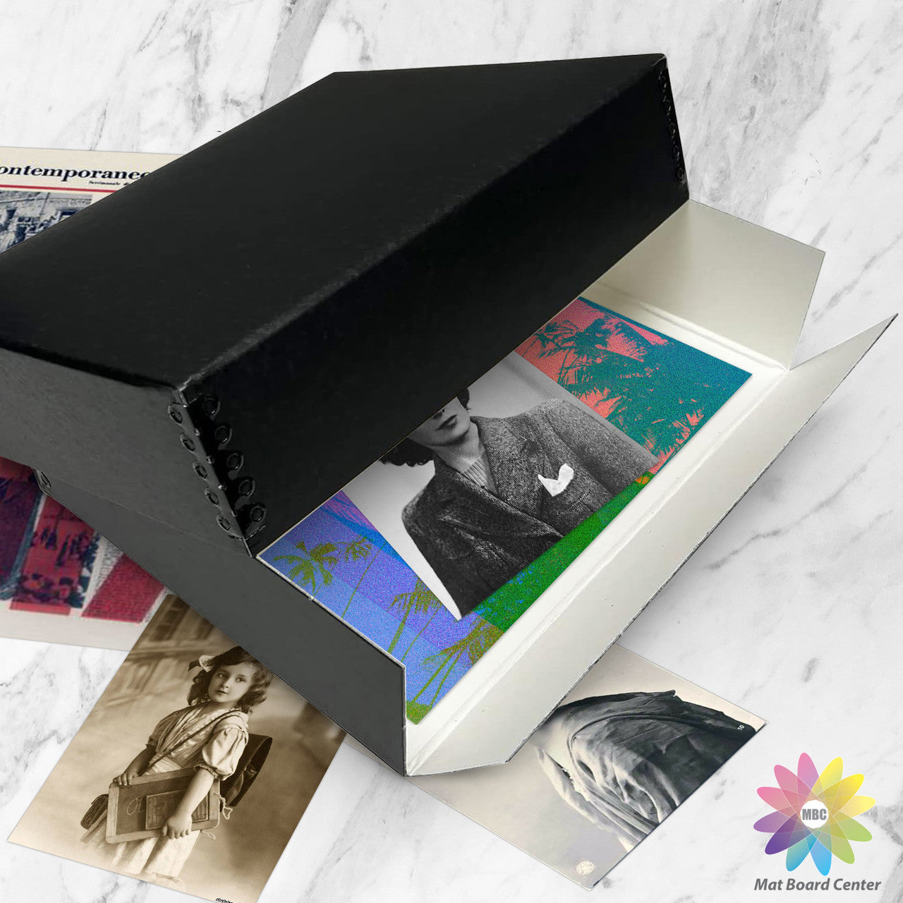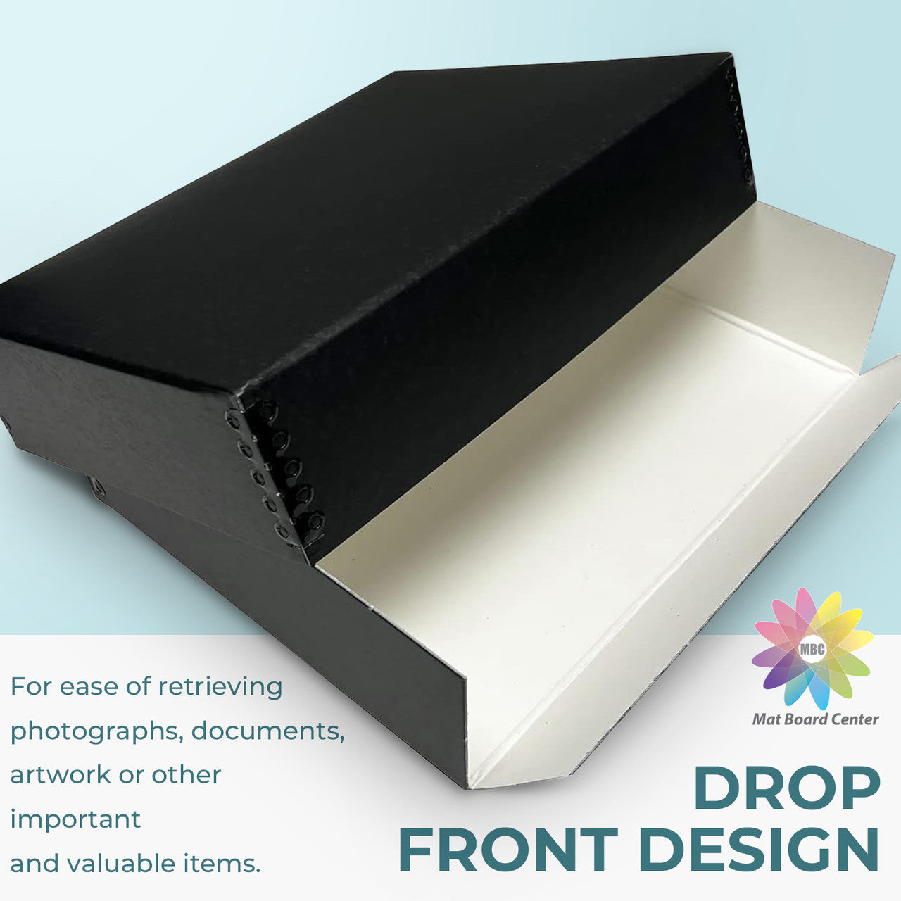 Lineco metal edge storage boxes are acid-free, lignin-free, made with 60 point board, and designed with a drop front for ease of retrieving photographs, documents, artwork or other important and valuable items. Acid, airborne pollutants, light and dirt can attack your treasured possessions causing them to deteriorate, fade and discolor. Lineco archival storage boxes defend against these contaminants to protect your treasured possessions for generations to come.