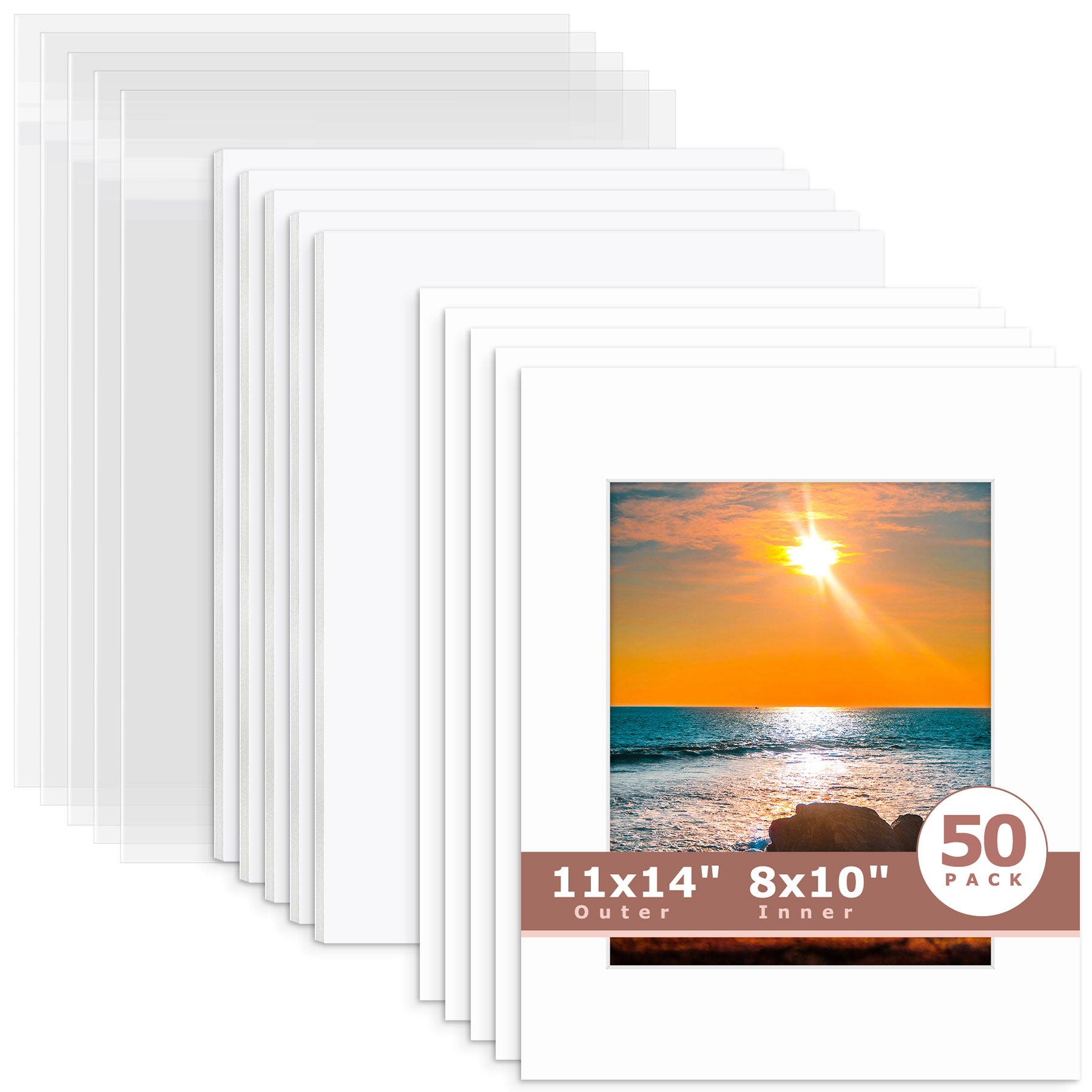 50 Pack 11x14 Whitecore Pre-Cut Mat Board + White Foam Board + Bag 8.5x11 (8x10.5 exact opening) N501 White