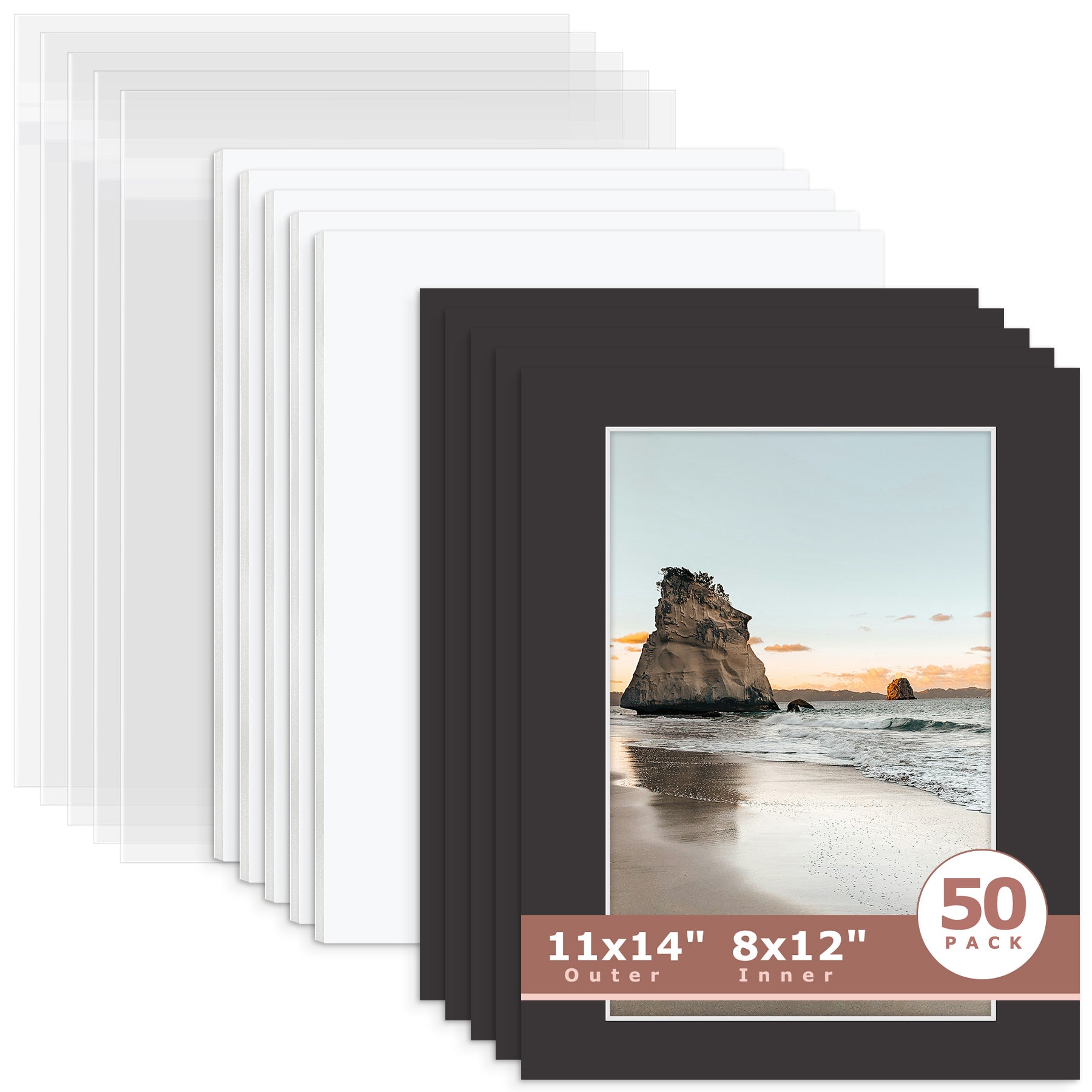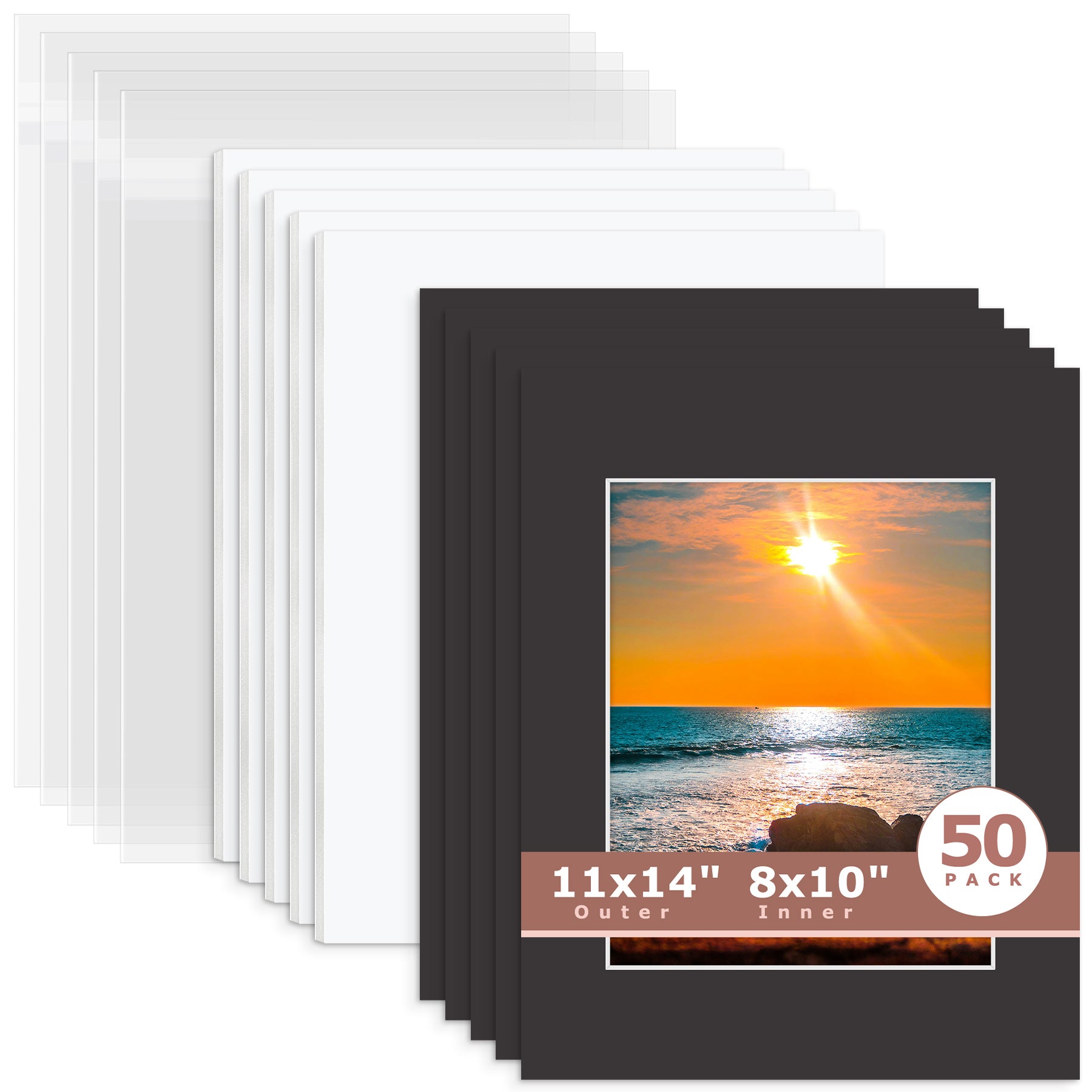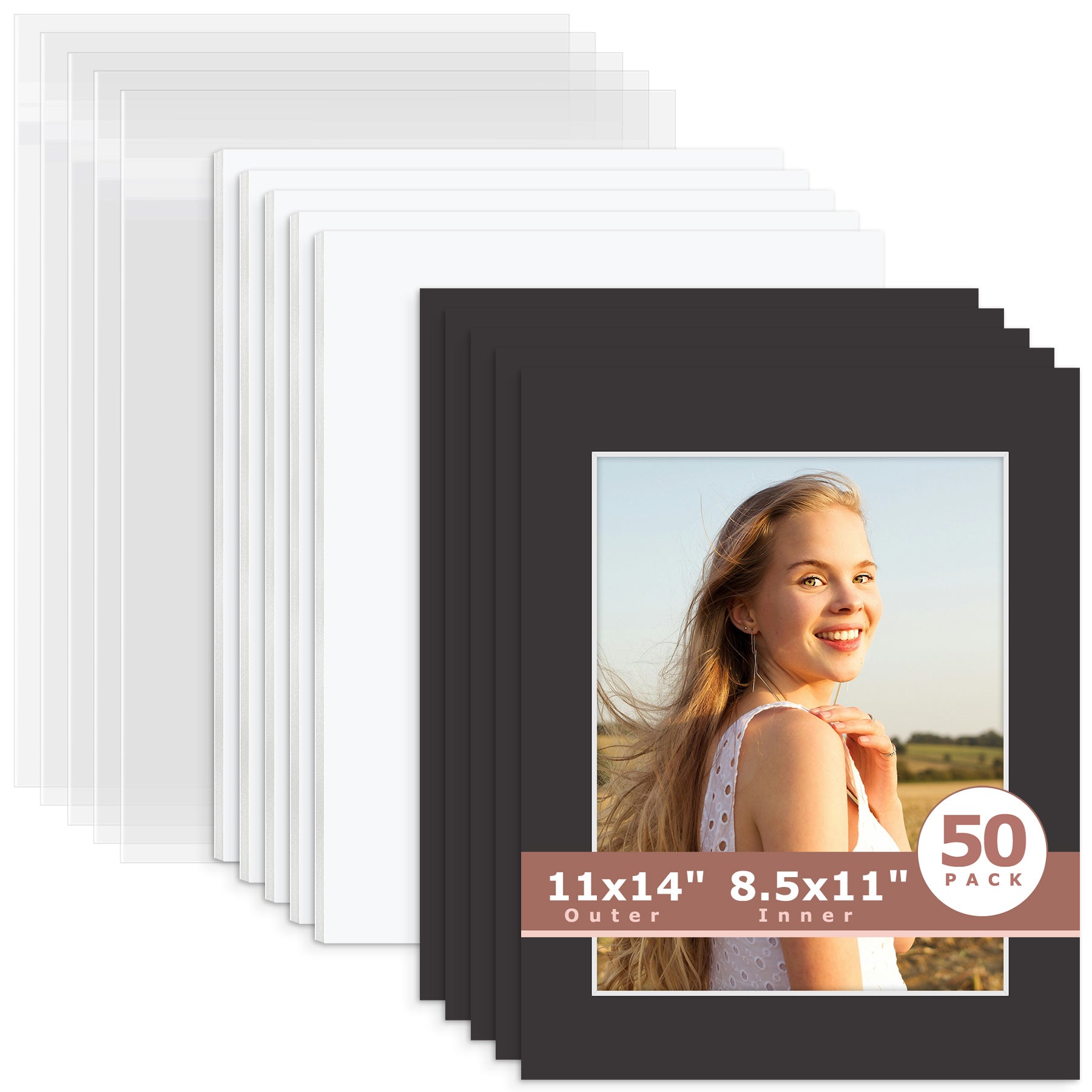 50 Pack 11x14 Whitecore Pre-Cut Mat Board + White Foam Board + Bag 8.5x11 (8x10.5 exact opening) N142 Tricom Black