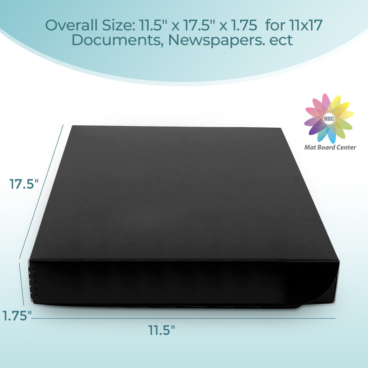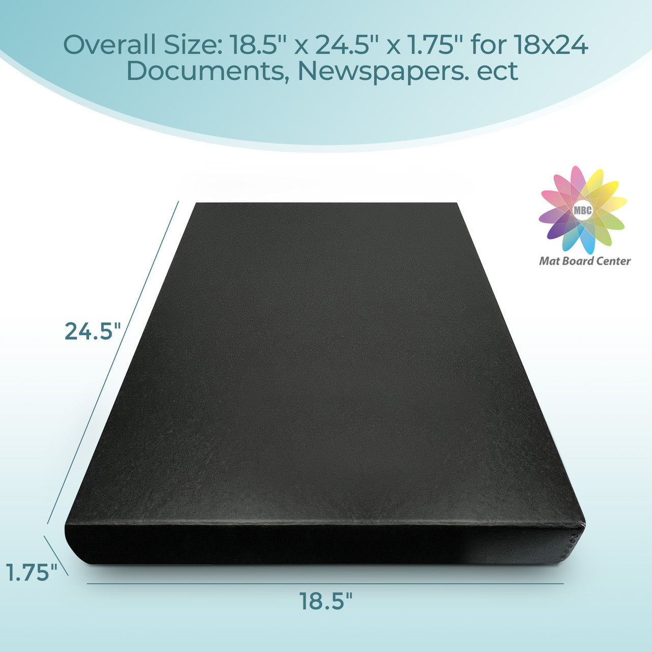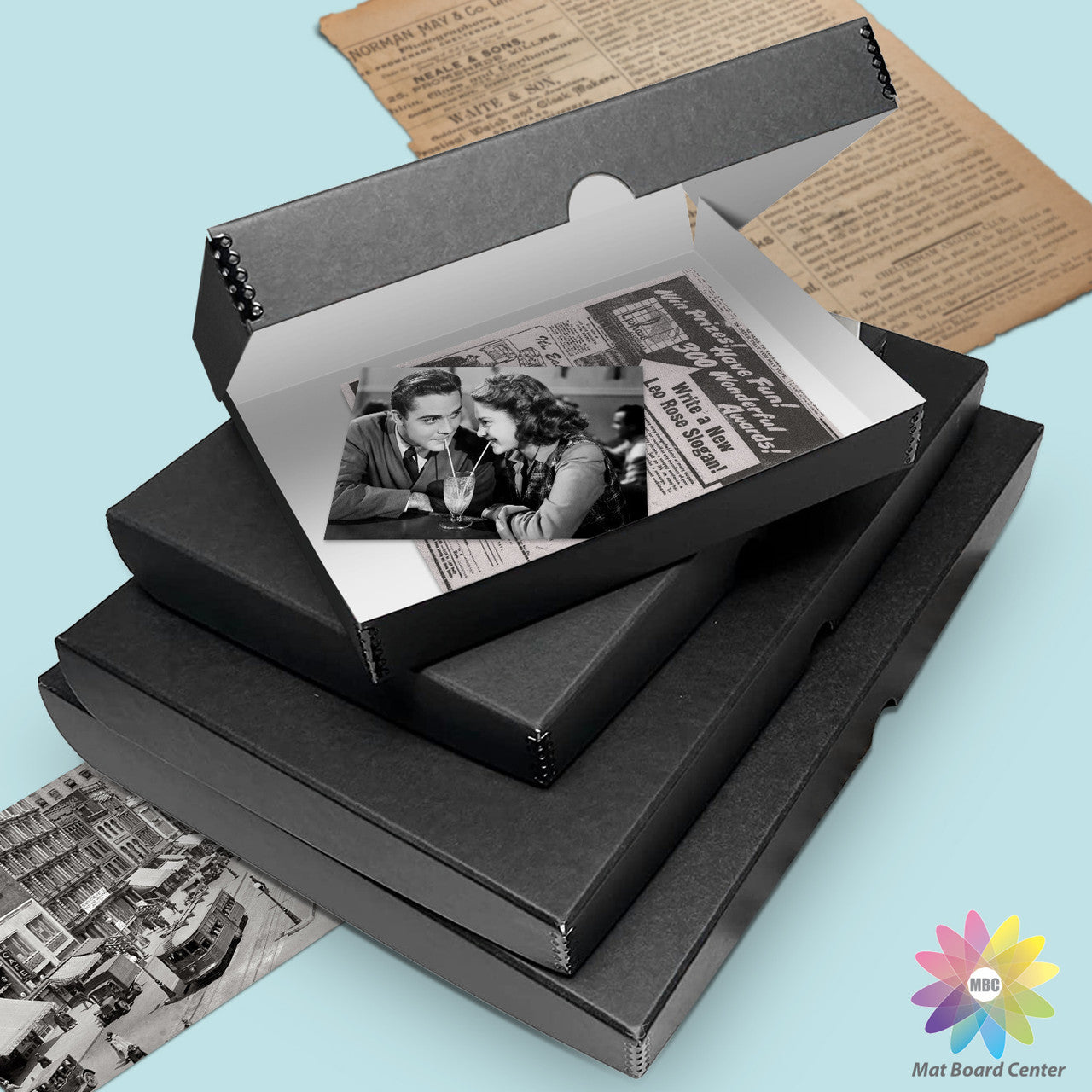 Available in traditional black and gray museum grade archival boxboards. These folio boxes are excellent for both artists and photographers with box sizes to accommodate standard sheet sizes. Everyday use includes storage of important documents, maps, newspapers, and other personal items.