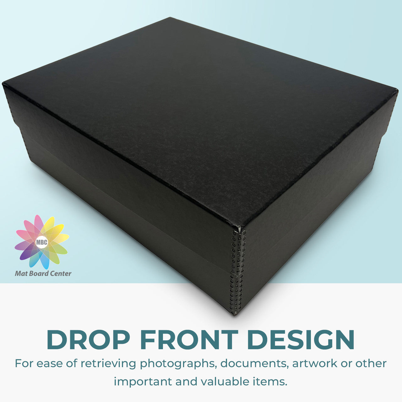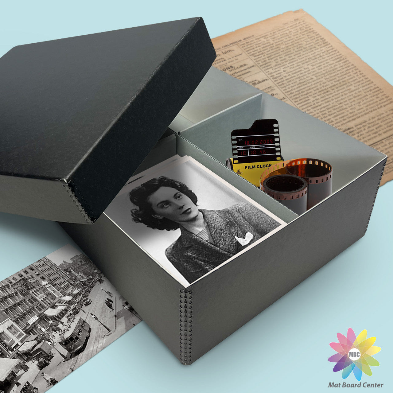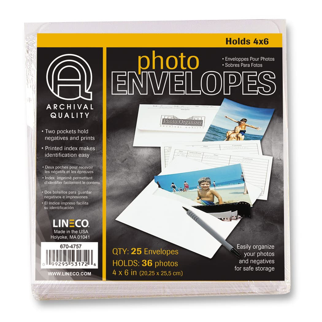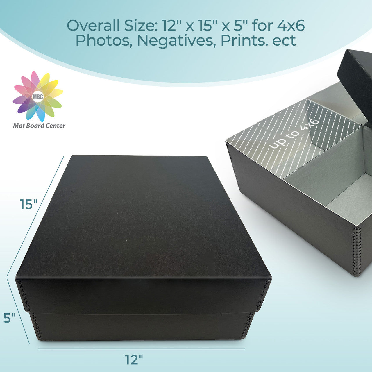 When you love to take pictures but can't seem to find the time to store and organize them properly, these sturdy acid-free storage containers provide a quick, convenient method of assuring your photographs are kept in safe conditions while they await your special attention. Each box has four internal sections and is available with or without 50 archival photo organizer envelopes to protect your photos and negatives. Metal edge reinforced corners on attractive tuxedo black board provide plenty of stacking strength. Designed to hold 1700 photos up to 4" x 6" and their negatives. Overall size is 15.5" x 12" x 5".