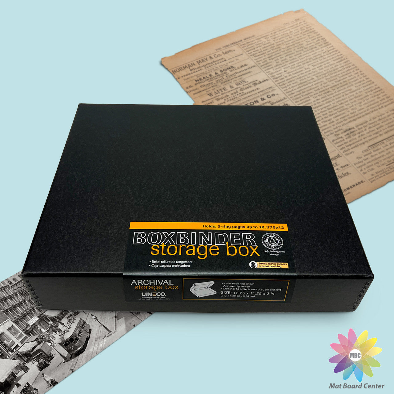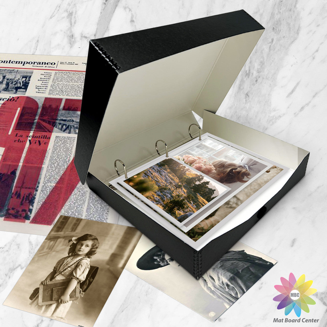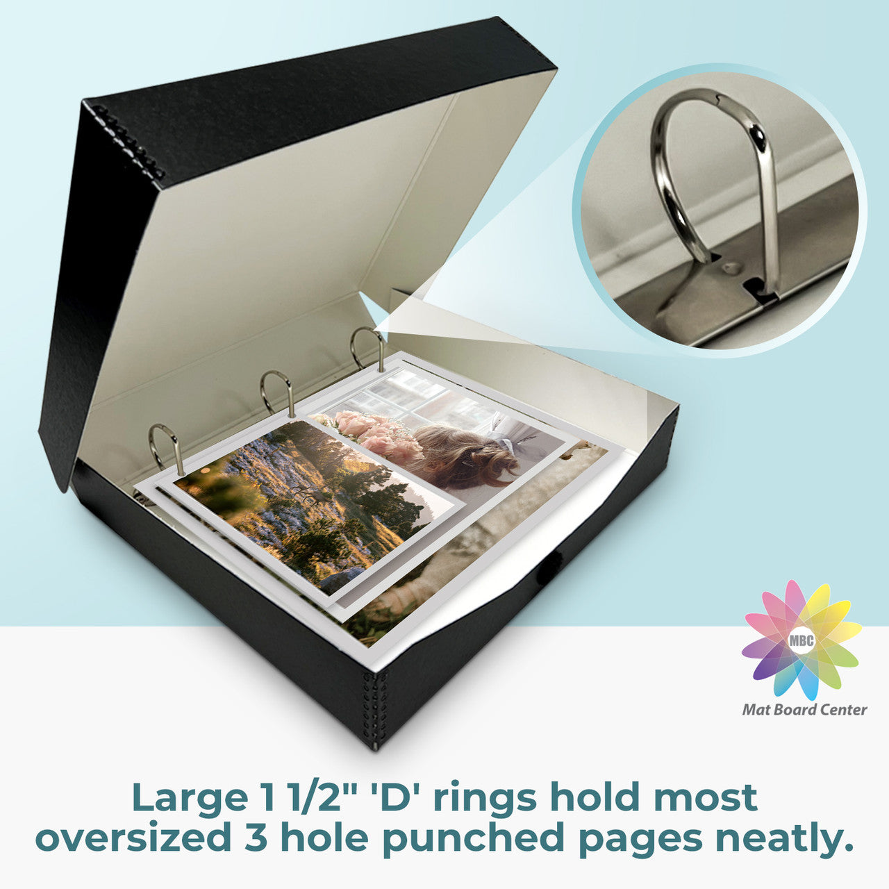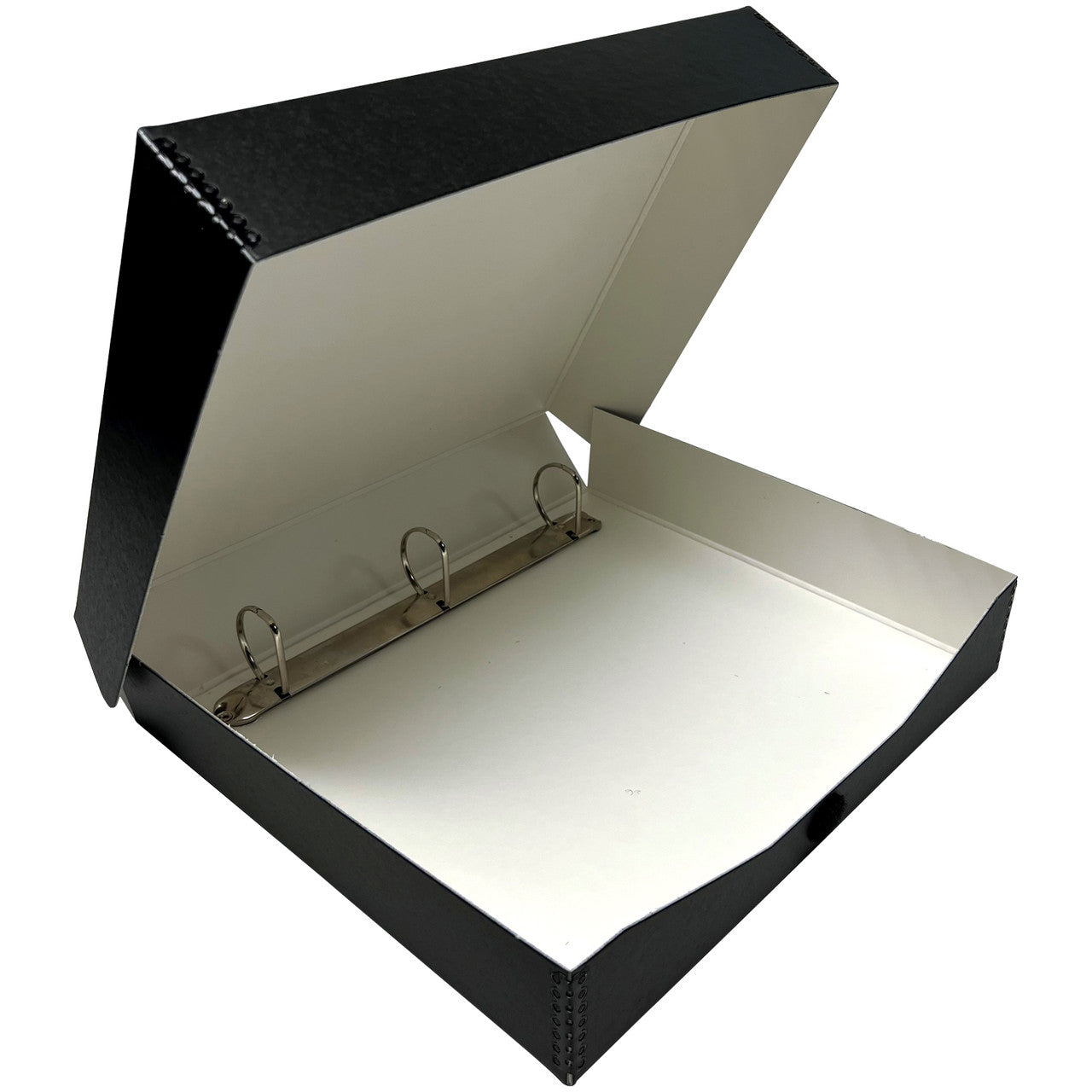 Keep important documents and photos secure with these stylish, functional, and cost-effective box binders. Featuring black metal corners for added stacking strength, they also enhance the durable, acid-free matte exterior. Inside, a 1.5" ring binder (D-Ring for Black, O-Ring for Tan) ensures contents stay firmly in place and fits most standard 3-ring pages. A variety of Archival Quality Pages are available to complement these box binders. Sold individually.