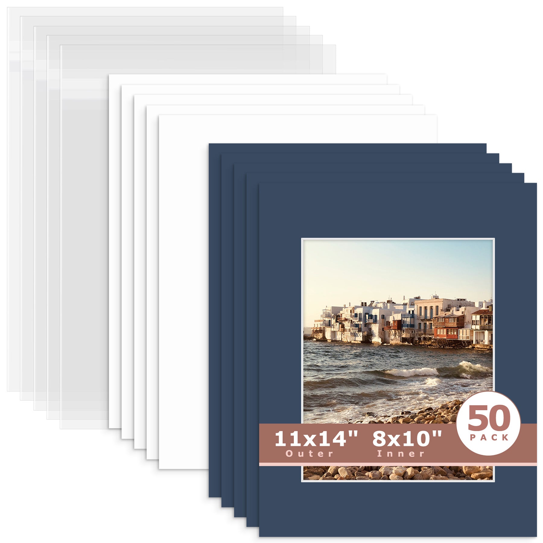 50 Pack 11x14 Whitecore Pre-Cut Mat Board + Backing + Bag 8x10 (7.5x9.5 exact opening) N222 Deep Blue