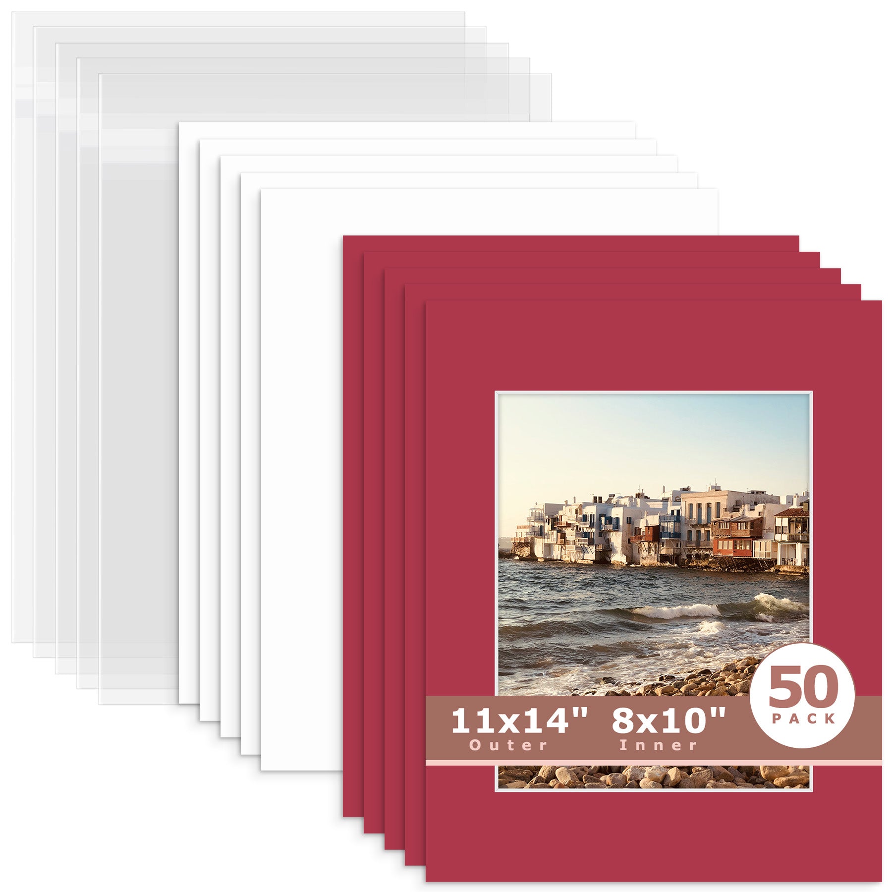 50 Pack 11x14 Whitecore Pre-Cut Mat Board + Backing + Bag 8x10 (7.5x9.5 exact opening) N117 China Red