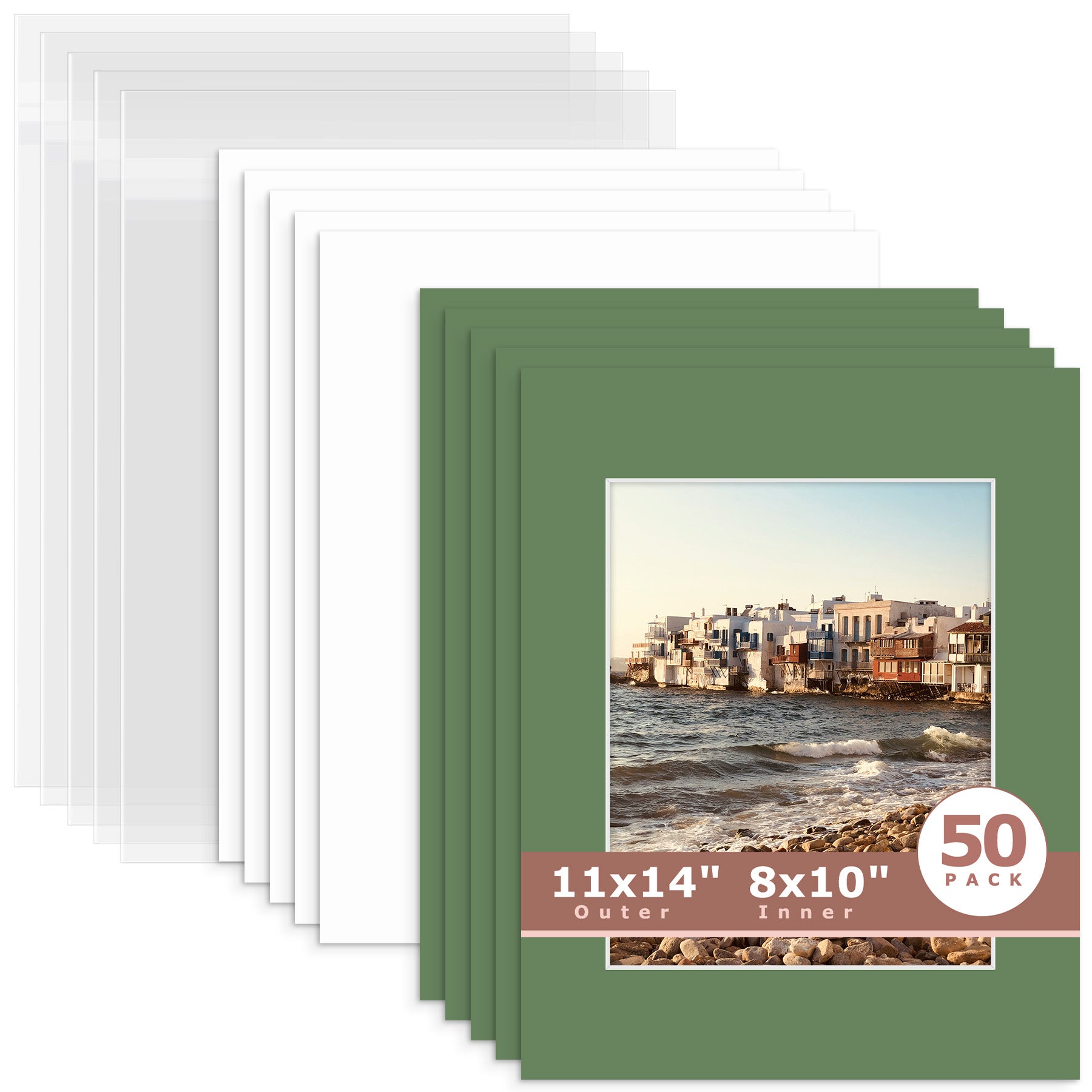 50 Pack 11x14 Whitecore Pre-Cut Mat Board + Backing + Bag 8x10 (7.5x9.5 exact opening) N163 Organic Green
