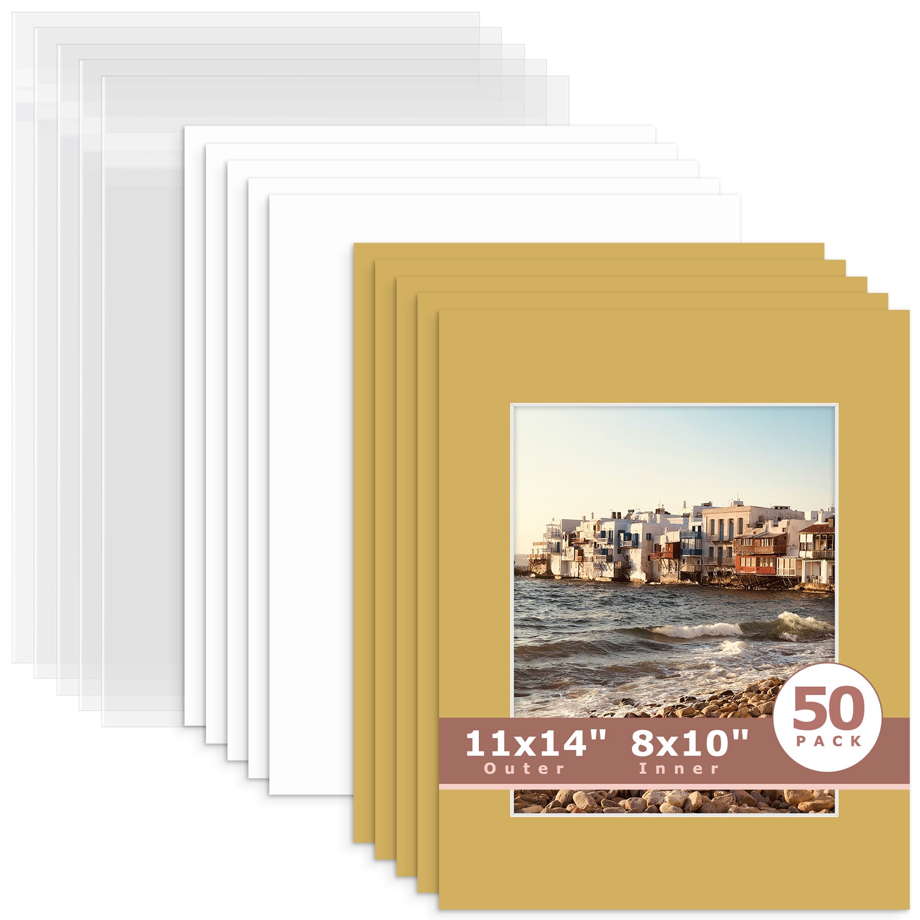 50 Pack 11x14 Whitecore Pre-Cut Mat Board + Backing + Bag 8x10 (7.5x9.5 exact opening) N143 Old Gold