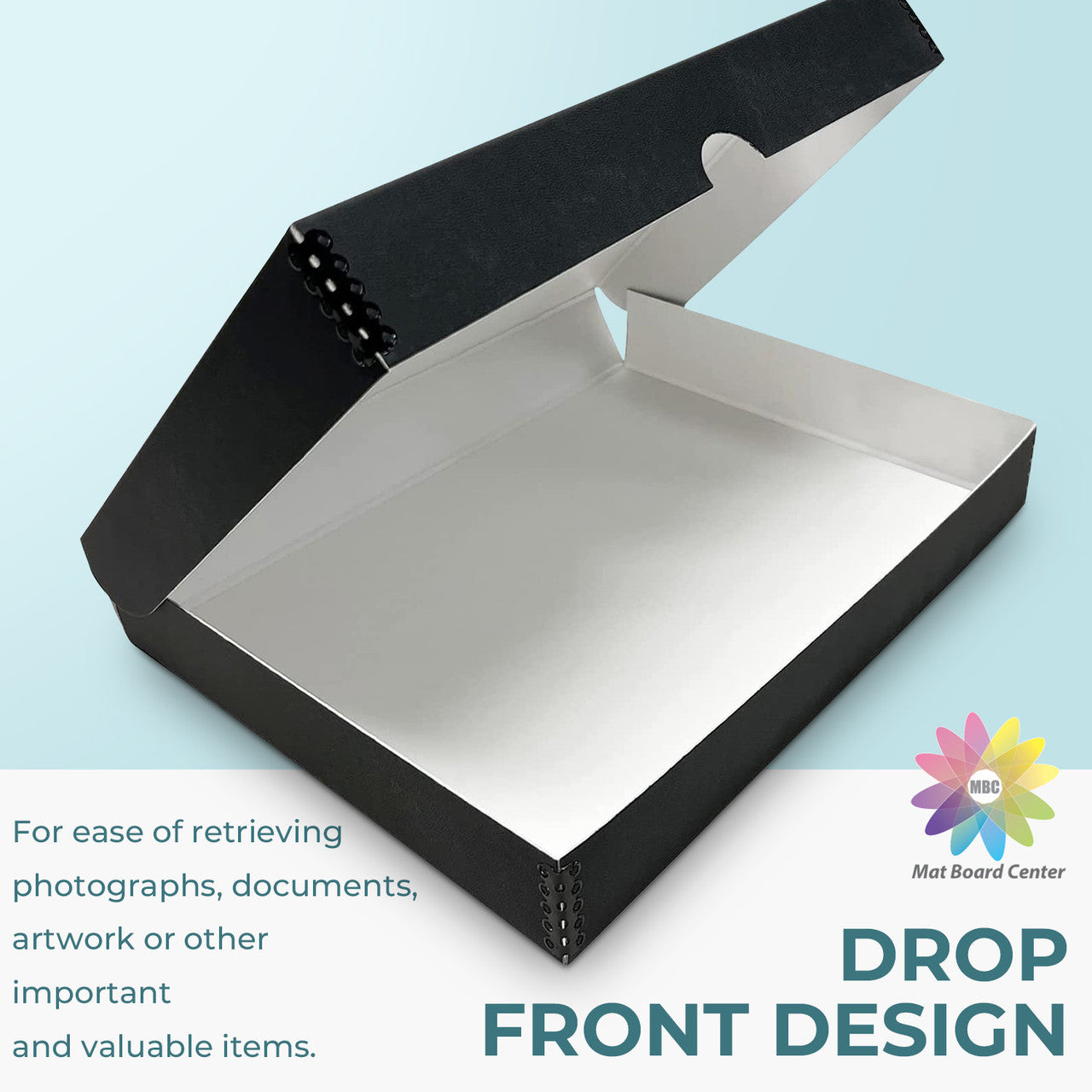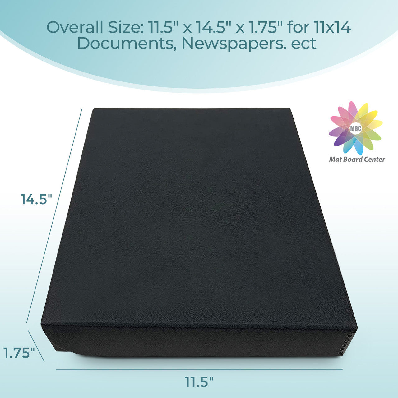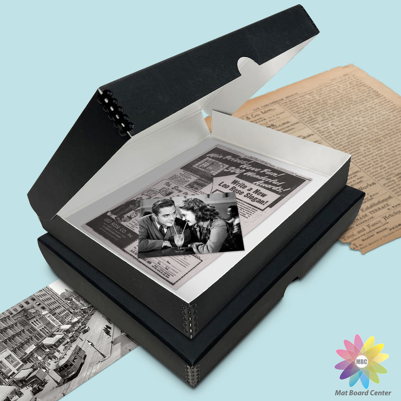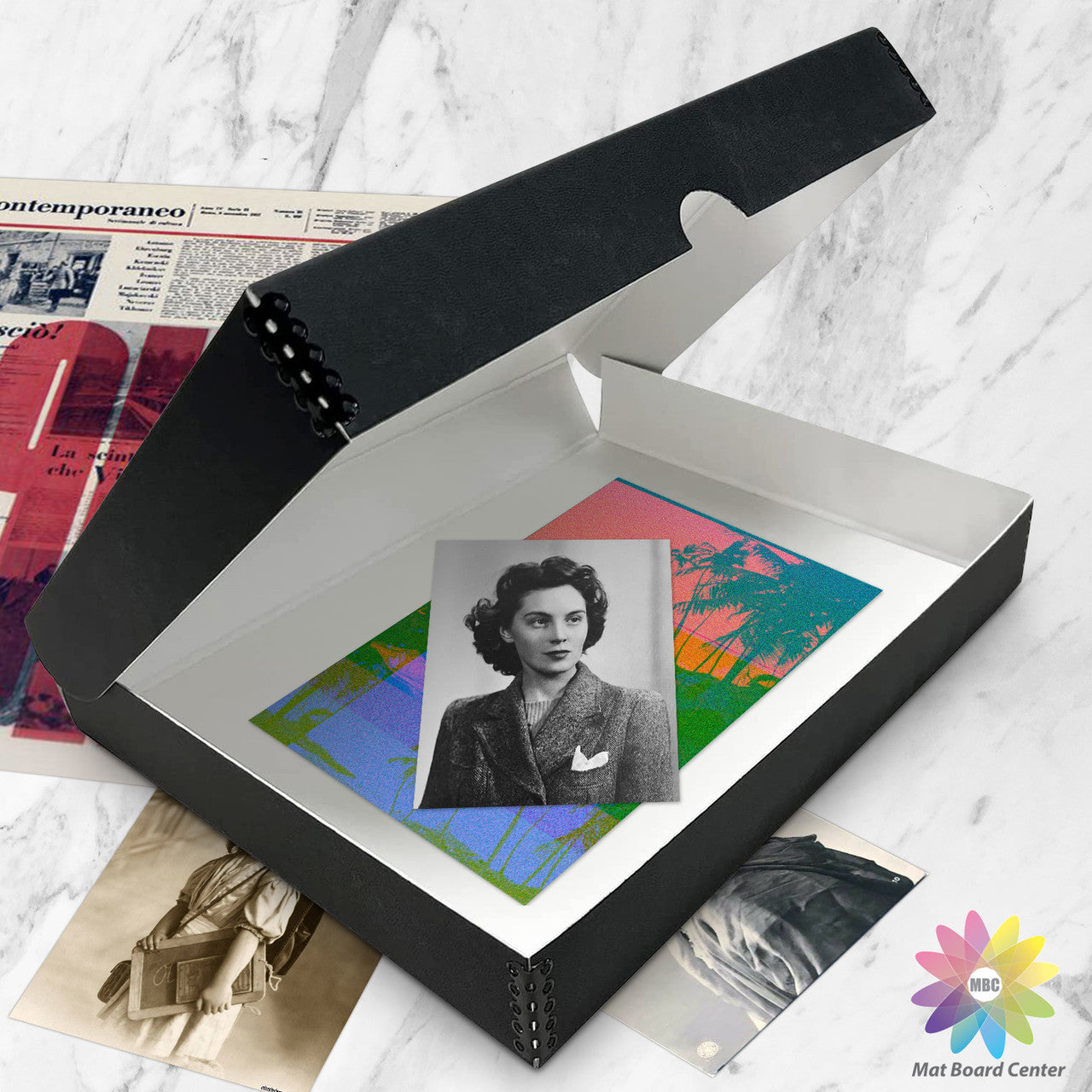 Lineco Folio Storage Boxes combine color, texture, and design into archival quality boxes with avant-garde appeal. Our faux leather covering feels like real leather – soft yet supple, and has a very classic look. The metallic covering looks like Birds's Eye Cloth and has a very modern look. Both styles are constructed with a clamshell design and feature a "thumb-cut" for ease of access. Metal-edge construction adds strength and longevity. Boxes also come in traditional Black and Gray archival boxboard to provide economical archival storage.
