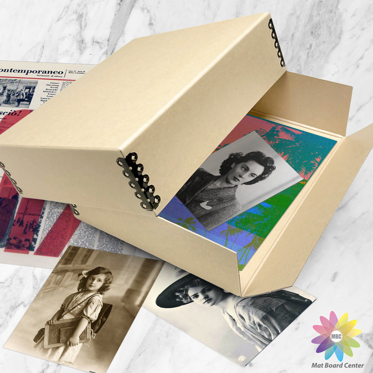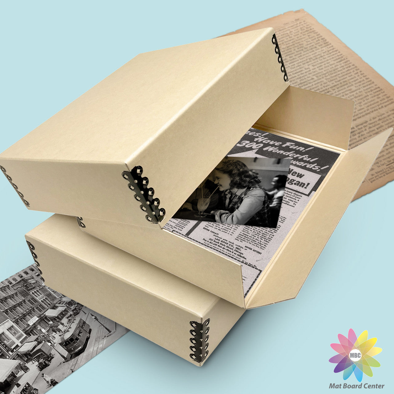 Lineco metal edge storage boxes are acid-free, lignin-free, made with 60 point board, and designed with a drop front for ease of retrieving photographs, documents, artwork or other important and valuable items. Acid, airborne pollutants, light and dirt can attack your treasured possessions causing them to deteriorate, fade and discolor. Lineco archival storage boxes defend against these contaminants to protect your treasured possessions for generations to come.